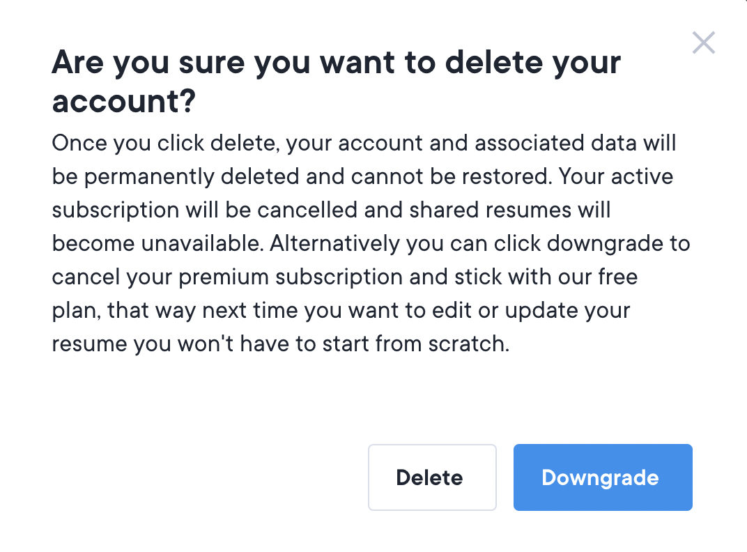 If you’d like to cancel or downgrade your account, you can do so directly from our CVapp.ie app. Simply log in and click the dropdown menu located in the upper right corner. From there, select “Account Settings” and follow the prompts to cancel or downgrade your account. Please remember that choosing to delete your account is a permanent action and will delete all of your information. You will receive a warning like this:
