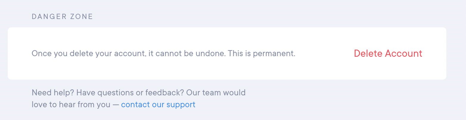 To permanently delete your account, navigate to the bottom of the Account Settings page and select the “Delete Account” button. You’ll be prompted with a warning like this:
