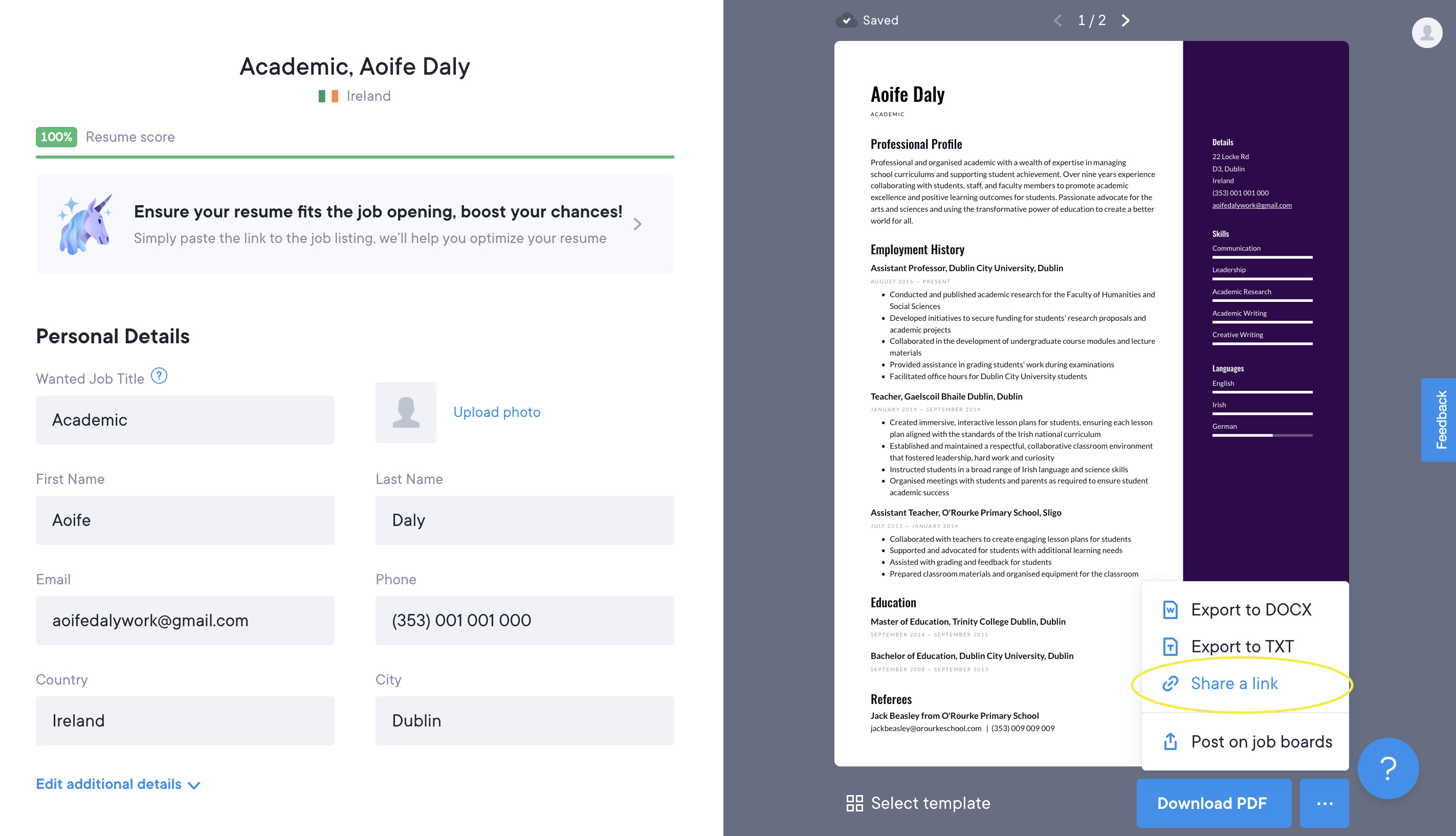 Once your CV is ready, you can take advantage of CVapp.ie's free service to share an online link to your CV or cover letter. Your materials remain private by default and are only shared when you choose to share them. You can easily download a PDF of your cover letter to save and share with potential employers.