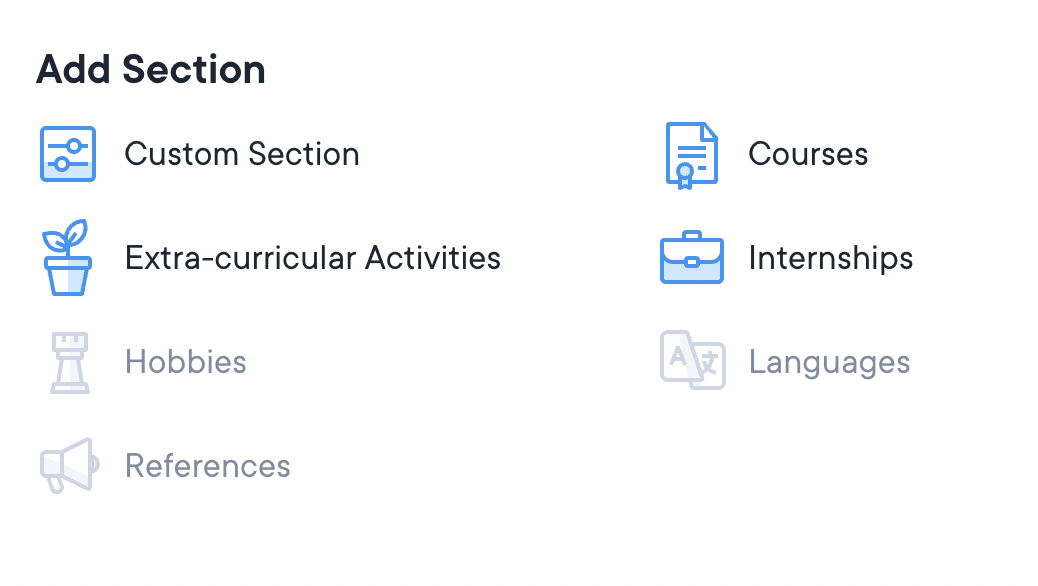 To further customise your CV, you can also use custom sections. You can rename sections to any title you’d like to include. Adding a custom section is easy! Simply scroll down to the bottom of the CV Editor where you’ll find various options for adding new sections. From there, you can create and customise additional sections as needed.