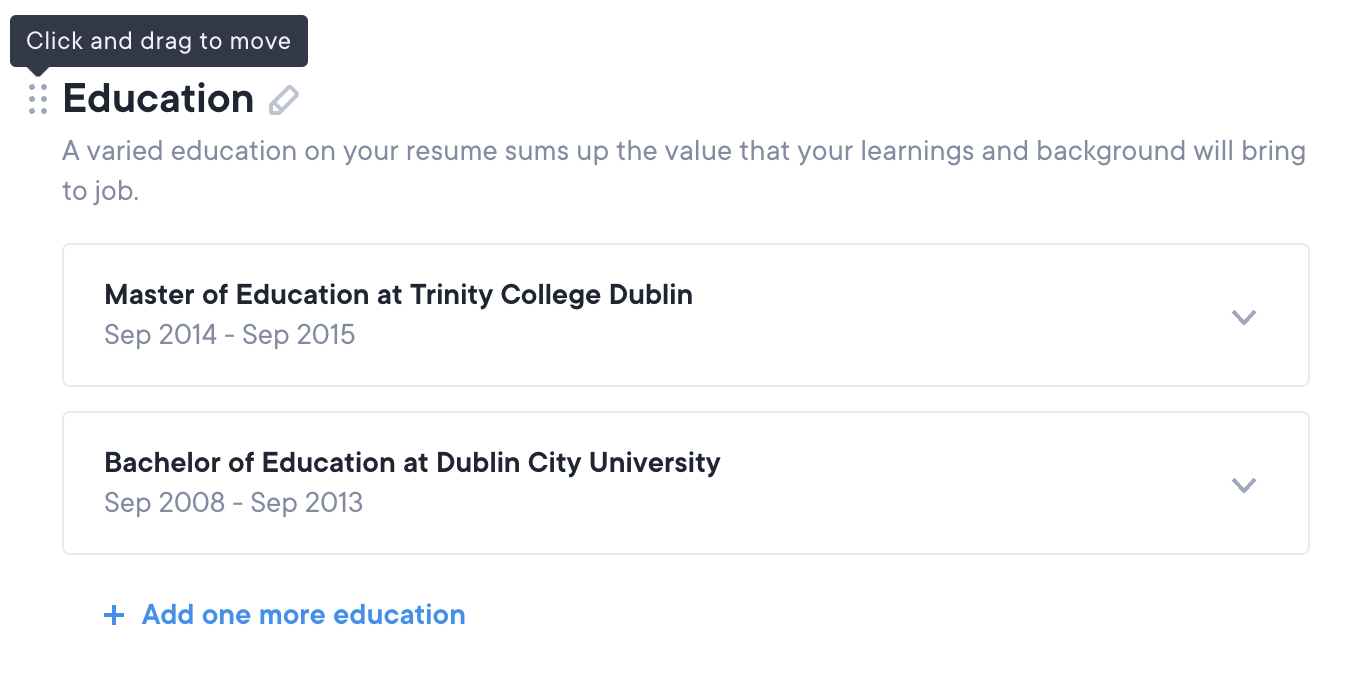 Please note: Currently, there are some limitations with CV customisations. As of right now, we cannot move the skills section from right to left or add a margin or page break. You also cannot adjust font sizing. Rest assured, we are constantly improving and hope to add more customisation features in the future!